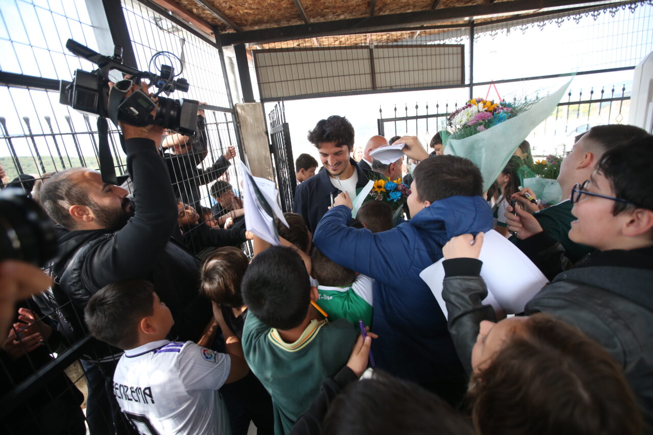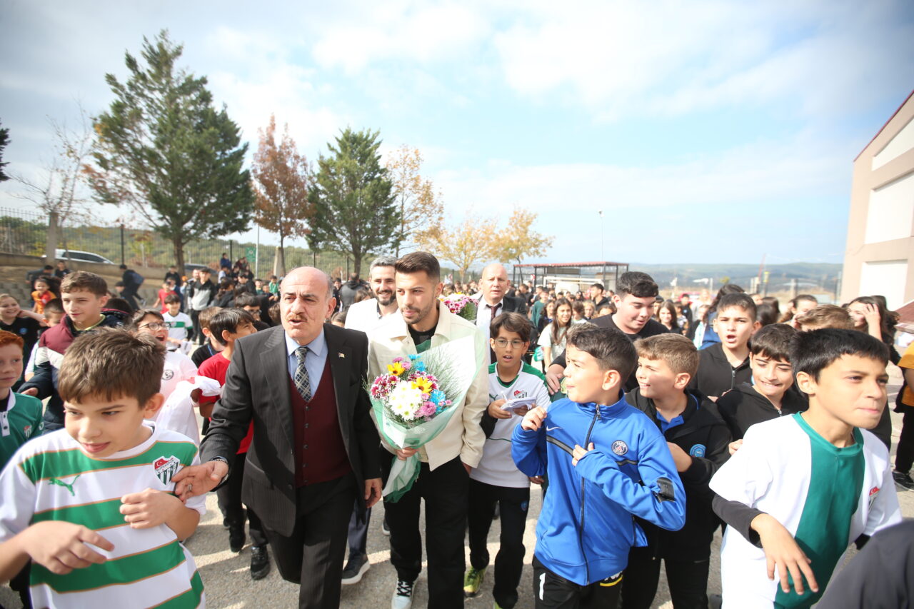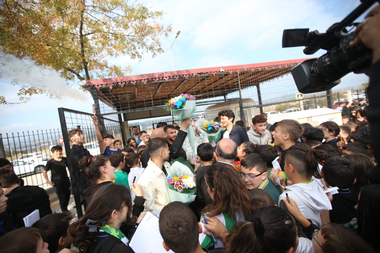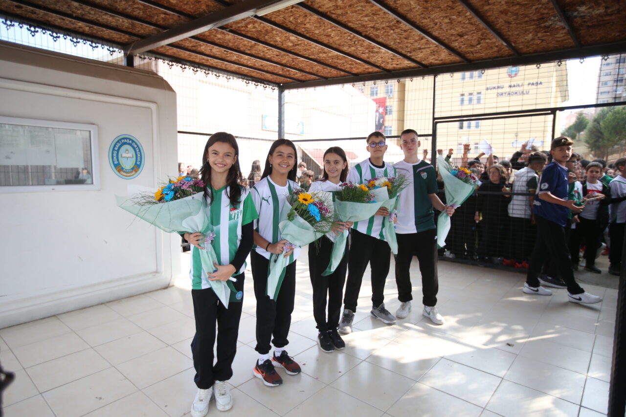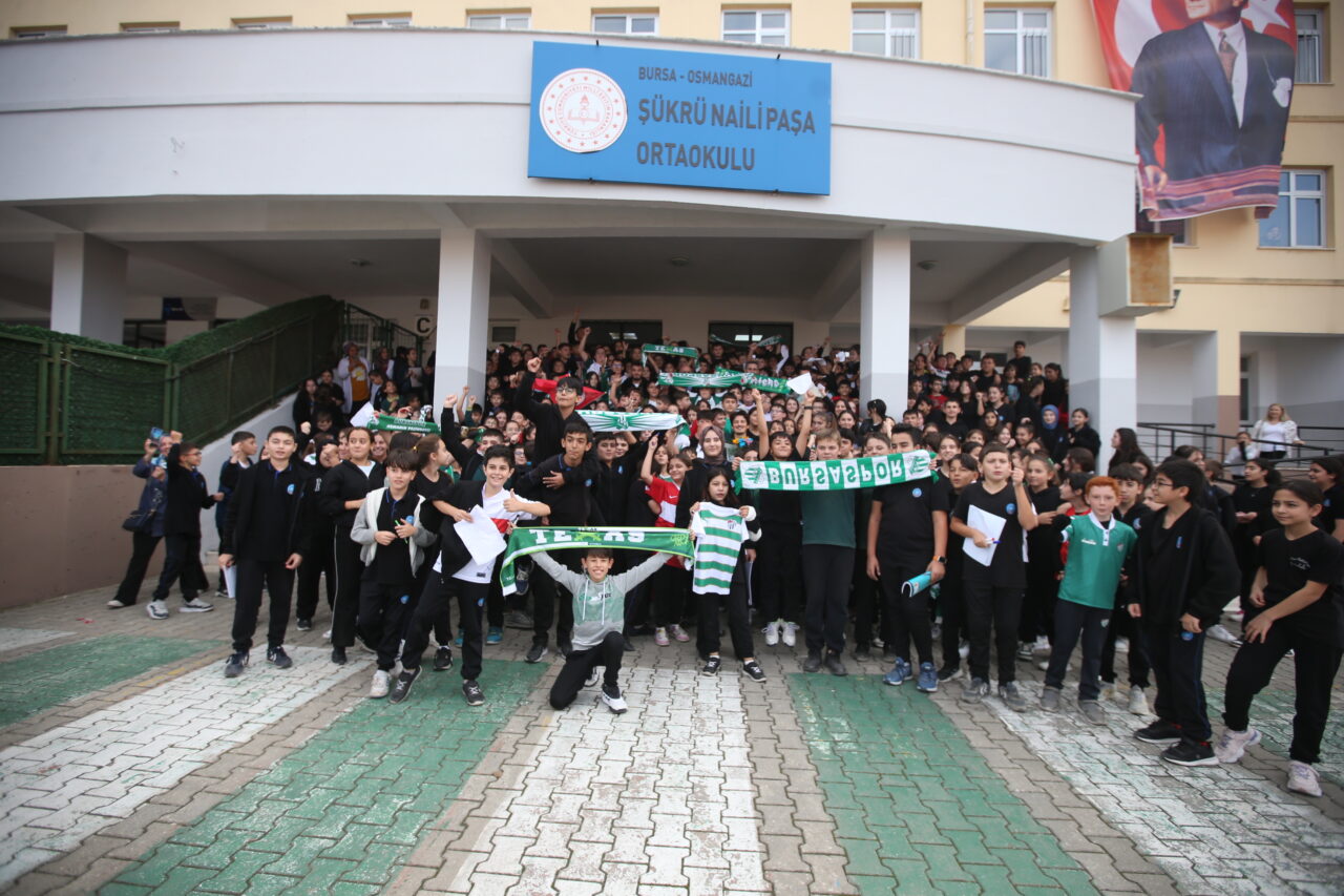 Şükrü Naili Paşa Ortaokulu girişinde yüzlerce öğrenci Bursaspor formaları ve çiçeklerle futbolcuları karşılarken, marşlarla birlikte yeşil beyazlı oyunculara moral verdiler.