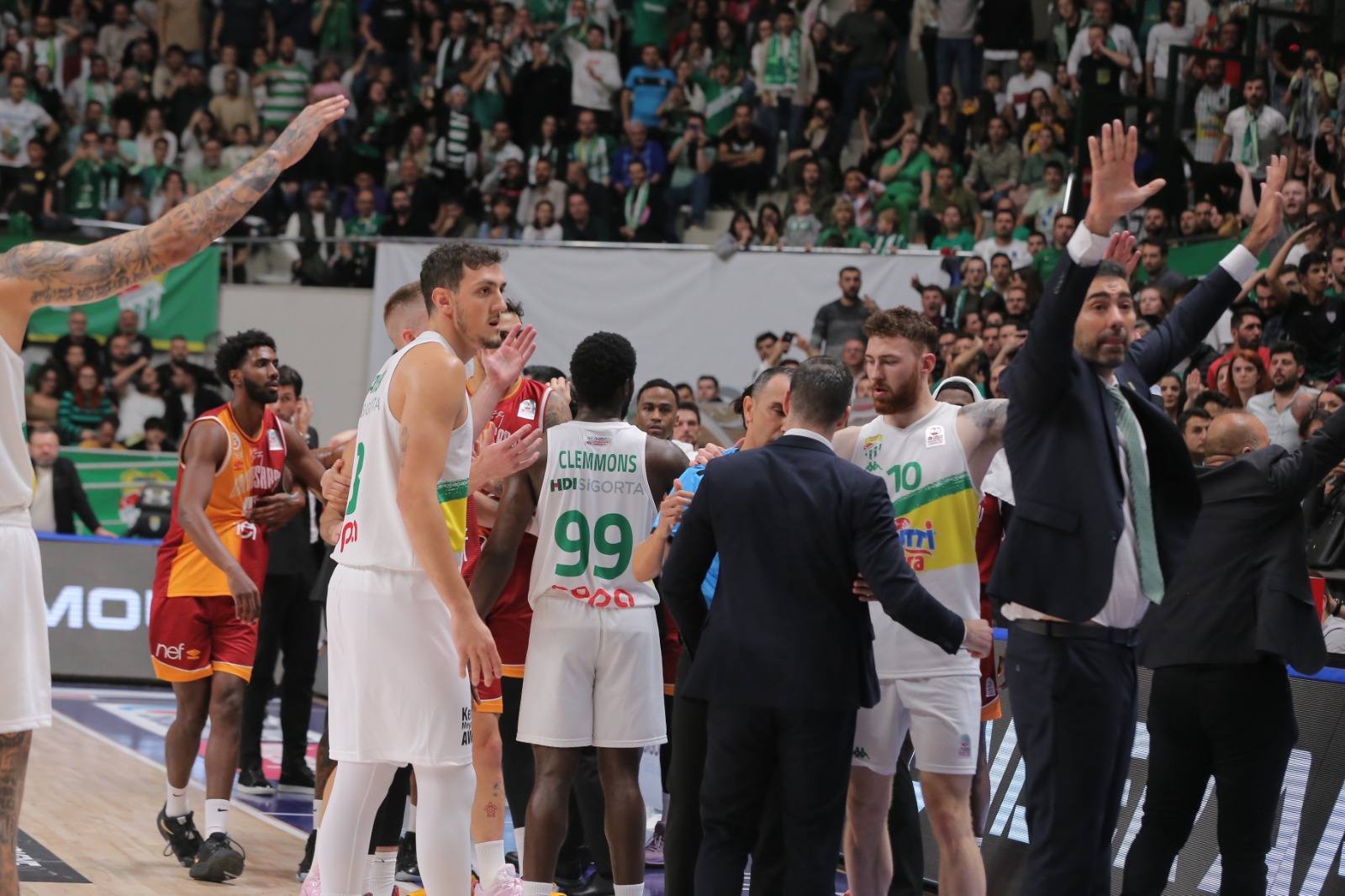 Zaman zaman oyuncular ve benchler arasında da gerginliklerin yaşandığı maçta hakemlerin kötü yönetimi tribünleri de gerdi. Bursaspor aleyhine çok kolay faul düdükleri çalan hakem üçlüsü yeşil-beyazlı takımın pota altı savunmasını adeta göçertti.
