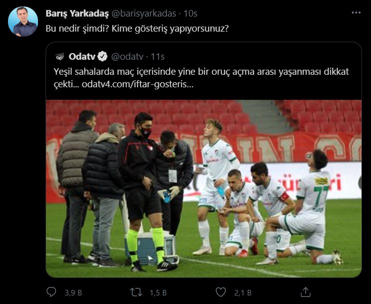 Hazar Çınarbabası adlı bir diğer kullanıcı ise “18-20 yaşında siyasetle alakası olmayan çocuklar niye, kime gösteriş yapsınlar. Her şeyi yaftalamaya gerek yok. Tribünde defalarca oruç açtım. Kimseye de gösteriş yapmadım. Muhalefetini iktidar ile yap, bu ülkenin çocukları ile değil.” şeklinde cevap verdi.