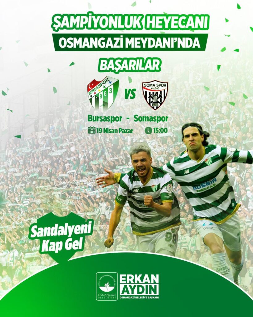 Yeşil-beyazlıların pazar günü Somaspor ile oynayacağı ve en az 1 puan alması halinde şampiyonluğunu ilan edeceği kritik karşılaşma, Osmangazi Meydanı’nda kurulacak dev ekranda taraftarlarla buluşacak.