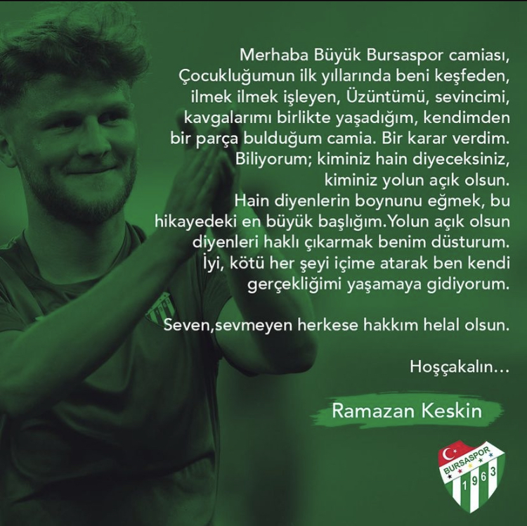 İşte bu Bursaspor’dan futbolcu gittimi hain damgası yapıştırmak çok kolay zamanında kulübün parasını harvurup savuranlar elini kolunu sallayarak ve gittiği her yerde itibar görürken gencecik çocuklar hayallerinin peşinden koştugu zaman hain damgası vurmak çok kolay elin yabancı topcusu parasını alamadığı zaman şikayet ettimi adam haklı profesyonel futbolcu bizim çokluklar yaptımı vatan haini olarak yakıştırma yapmak çok kolay herkes kendi hayatını Yaşar lütfen biraz saygı selamlar
