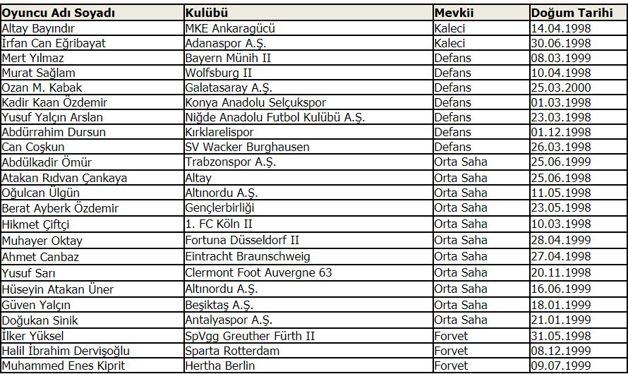 Bursaspor‘dan hiç bir oyuncunun bulunmadığı Ümit Milli Takım‘ın aday kadrosu ise şöyle: