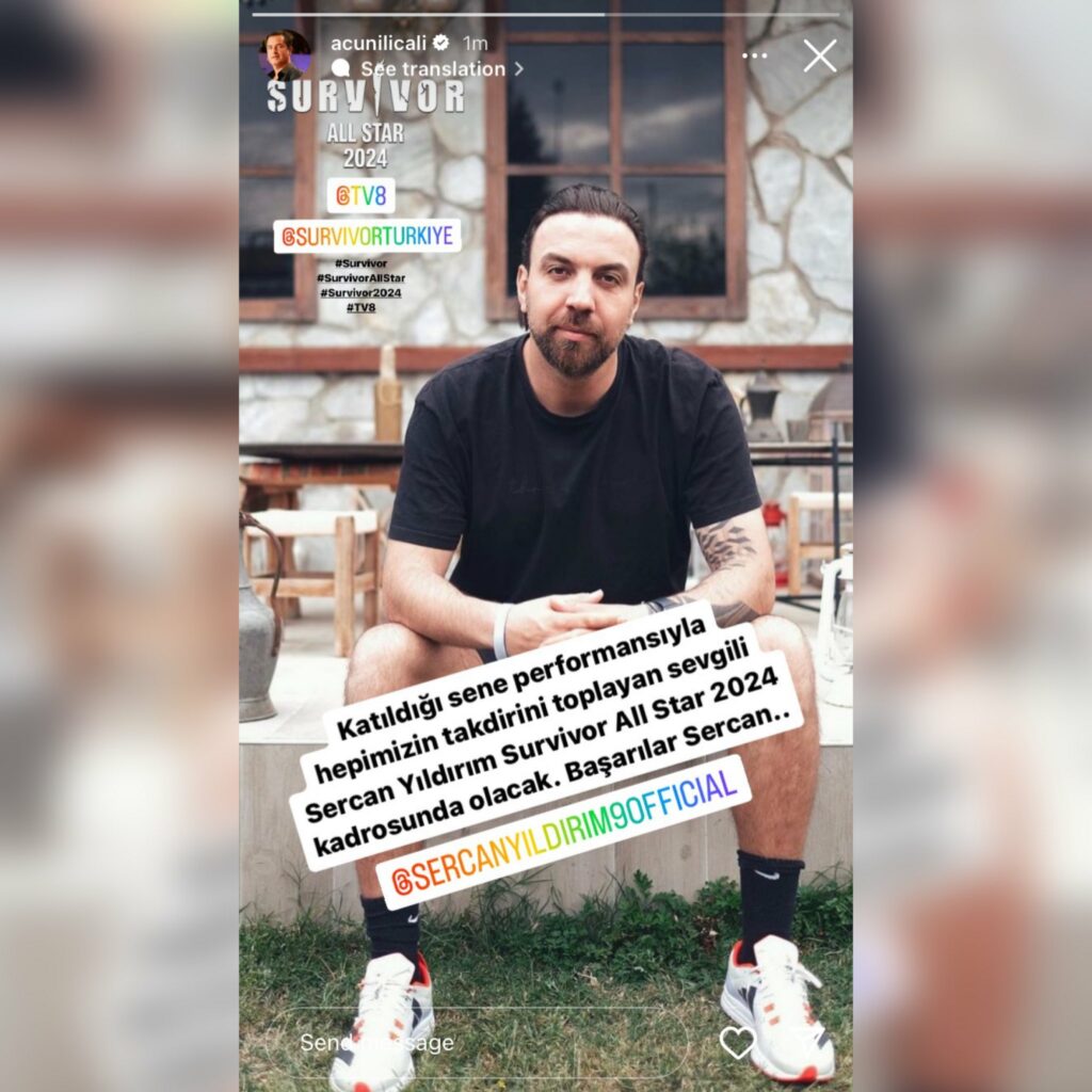 Acun Ilıcalı açıklamasında “Katıldığı sene performansıyla hepimizin takdirini toplayan sevgili Sercan Yıldırım Survivor All Star 2024 kadrosunda olacak. Başarılar Sercan…” ifadelerini kullandı.