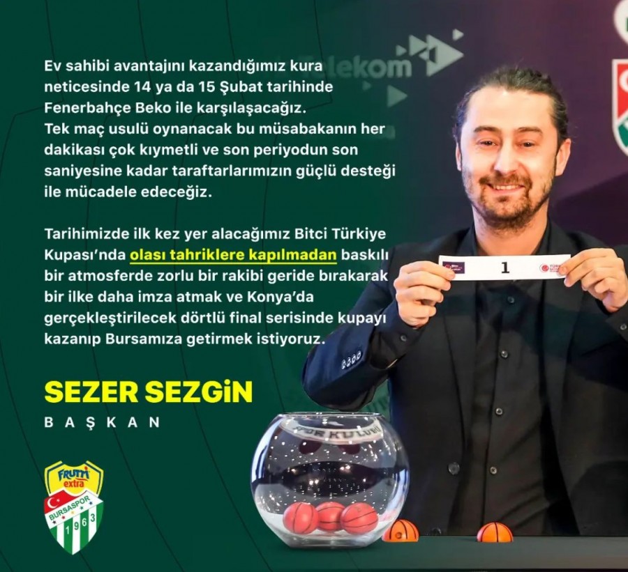 Tarihimizde ilk kez yer alacağımız Bitci Türkiye Kupası’nda olası tahriklere kapılmadan baskılı bir atmosferde zorlu bir rakibi geride bırakarak bir ilke daha imza atmak ve Konya’da gerçekleştirilecek dörtlü final serisinde kupayı kazanıp Bursamıza getirmek istiyoruz.