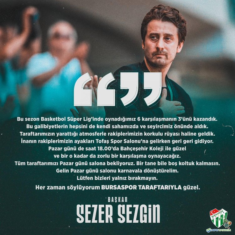 Bursaspor İnfo Yatırım Başkanı Sezer Sezgin, Bahçeşehir Koleji maçı öncesinde taraftarlara çağrıda bulundu.