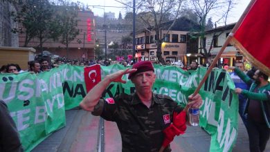 Zafer Plaza önünde toplanan yeşil-beyazlı taraftar, 18 Mart Çanakkale Zaferi için Ulucamii’ye kadar üzerinde “Düşmanda imkan vardı, Mehmetçikte iman. İşte…