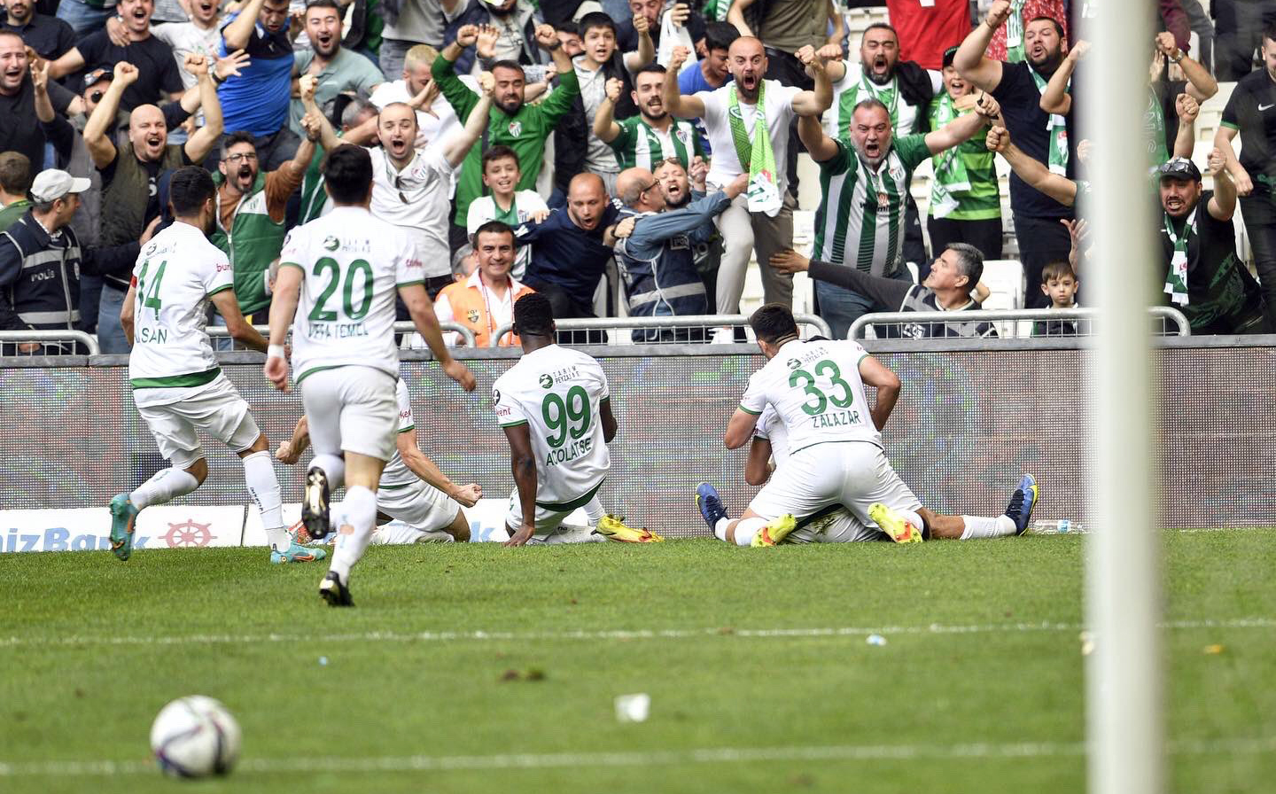 Bursaspor sevenler gözyaşları içinde heyecan ve sevinçten sırt üstü yere serildi! Şampiyonluk sezonunda bile böylesi görülmedi. Oyunun ilk 1 saatlik bölümü kimin düşeceği belli olmayan karşılıklı iki golle sırat köprüsü üstünde geçti.