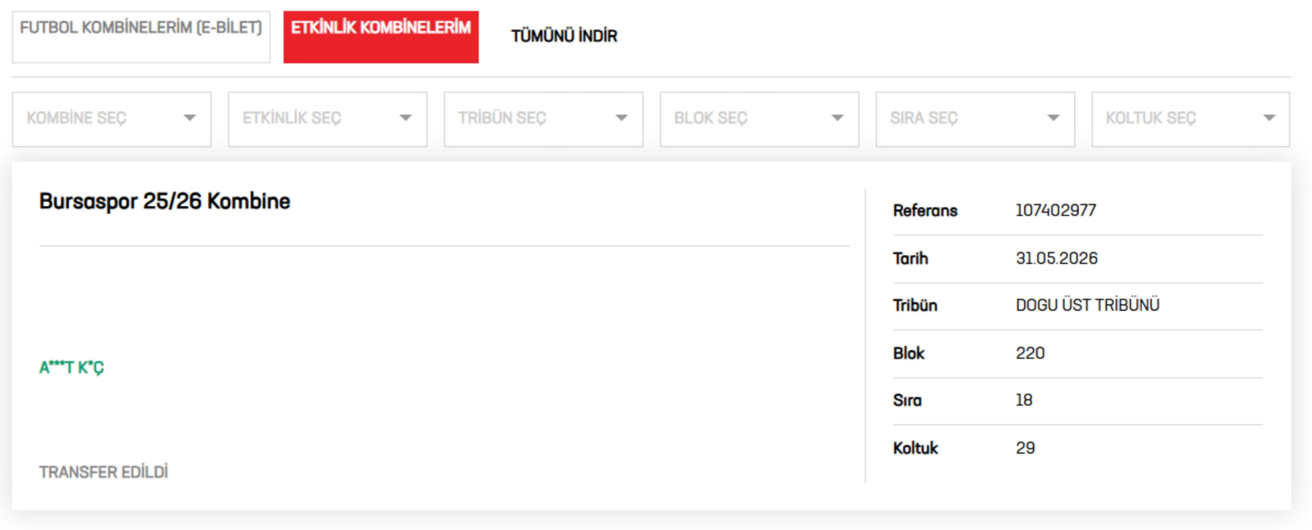 – Geçmişte Passolig / E-bilet kaydı olmayan taraftarlarımıza ait koltuklar TCKN ataması yapılmış olsa bile Passo’da TCKN üyeliği oluşmadığından kombine/kombineler işlem sahibinin hesabında kalır fakat bilet olarak görüntülenmez. Bu koltuğu/koltukları www.passo.com.tr adresi üzerinden ”web tarayıcı” işlem sahibi üye kendi hesabına girerek Etkinlik Kombinelerim bölümünde yer alan Transfer alanından kombinesini devir etmek istediği yakınına ait Passo Üyelik mail adresini girerek müsabakaya son 6 saat kalaya kadar transfer/devir işlemini gerçekleştirebilir.Matlı Stadyumu gişemiz her türlü soru veya sorun için 10:00-18:00 saatleri arası maç günü dahil hizmet verecektir. (Pazar günleri kapalı)