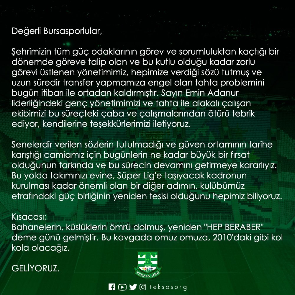Senelerdir verilen sözlerin tutulmadığı ve güven ortamının tarihe karıştığı camiamız için bugünlerin ne kadar büyük bir fırsat olduğunun farkında ve bu sürecin devamını getirmeye kararlıyız. Bu yolda takımınızı evine, Süper Lige taşıyacak kadronun kurulması kadar önemli olan bir diğer adımın, kulübümüz etrafındaki güç birliğinin yeniden tesisi olduğunu hepimiz biliyoruz.