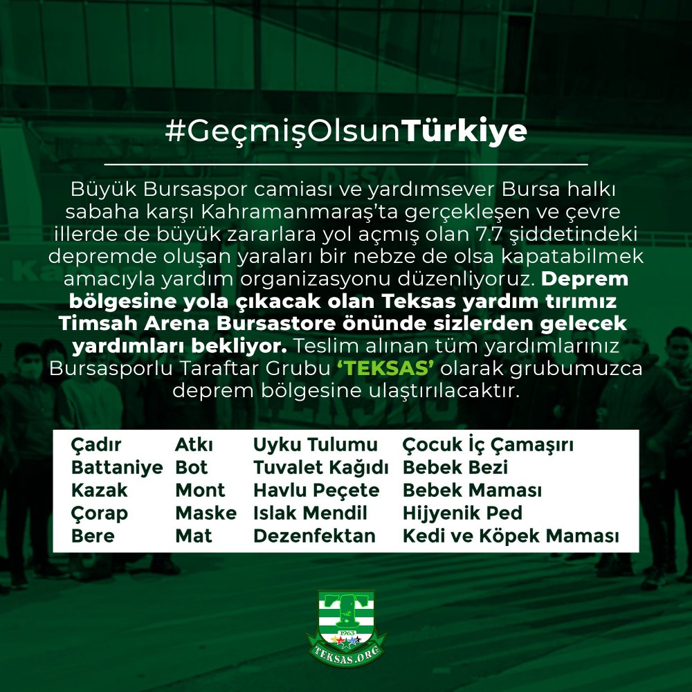 Teslim alınan tüm yardımlarınız Bursasporlu Taraftar Grubu ‘TEKSAS‘ olarak grubumuzca deprem bölgesine ulaştırılacaktır.