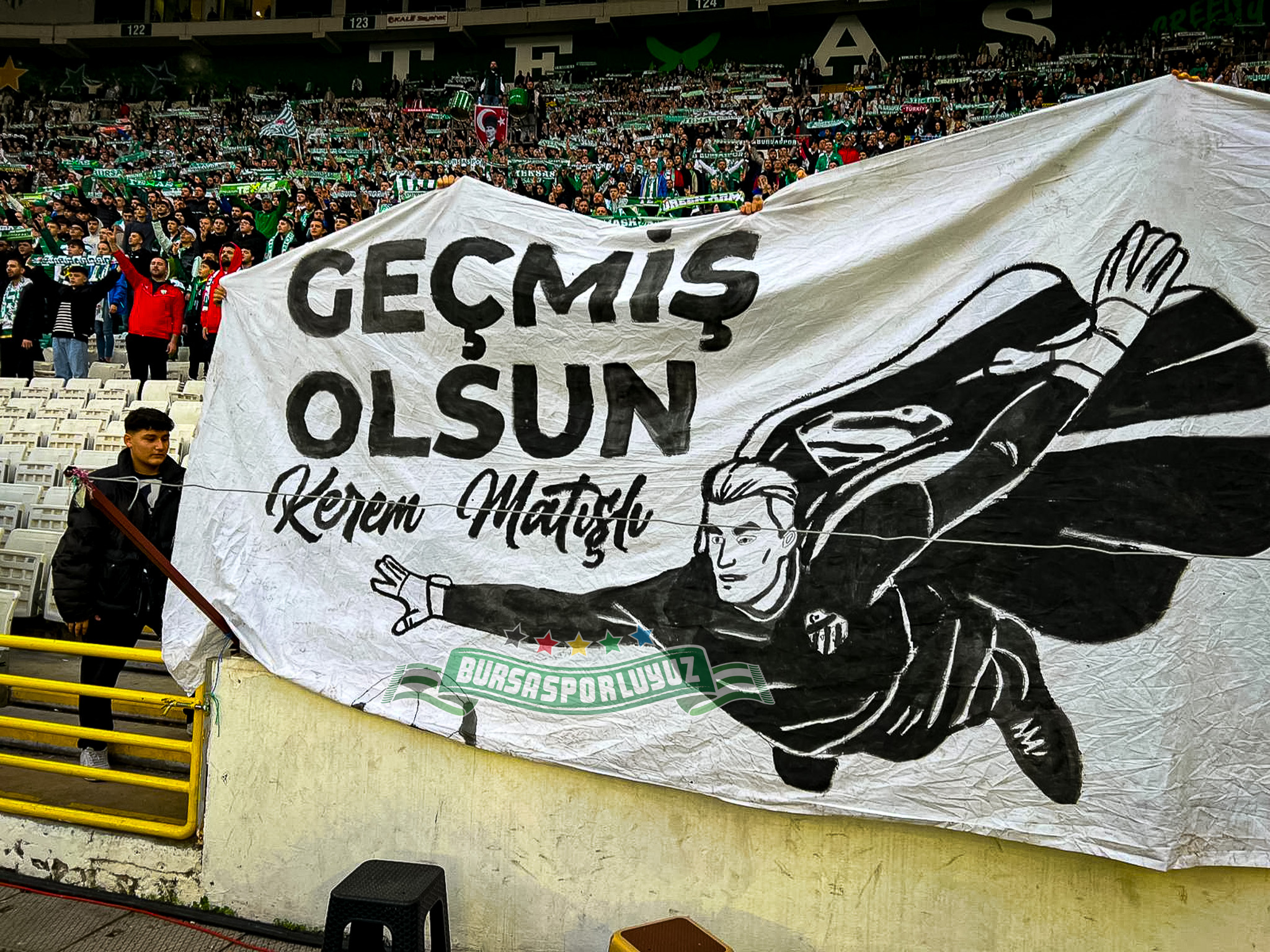 Bir diğer pankart ise Bursaspor’un geçtiğimiz hafta Mardin deplasmanında penaltı atışını kurtardıktan sonra sakatlanarak yaklaşık dört hafta sahalardan uzak kalacağı açıklanan kaleci Kerem Matışlı için hazırlandı. “Superman” temasıyla hazırlanan pankartta, “Geçmiş Olsun Kerem Matışlı” ifadeleri kullanıldı.