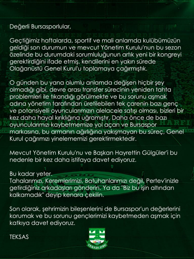 Teksas‘ın açıklamasının başlığında “Çağrımızı yineliyoruz. Bursaspor için gerekeni yapın, en yakın sürede Olağanüstü Seçimli Genel Kurul’u toplayın.” ifadelerini kullandı.