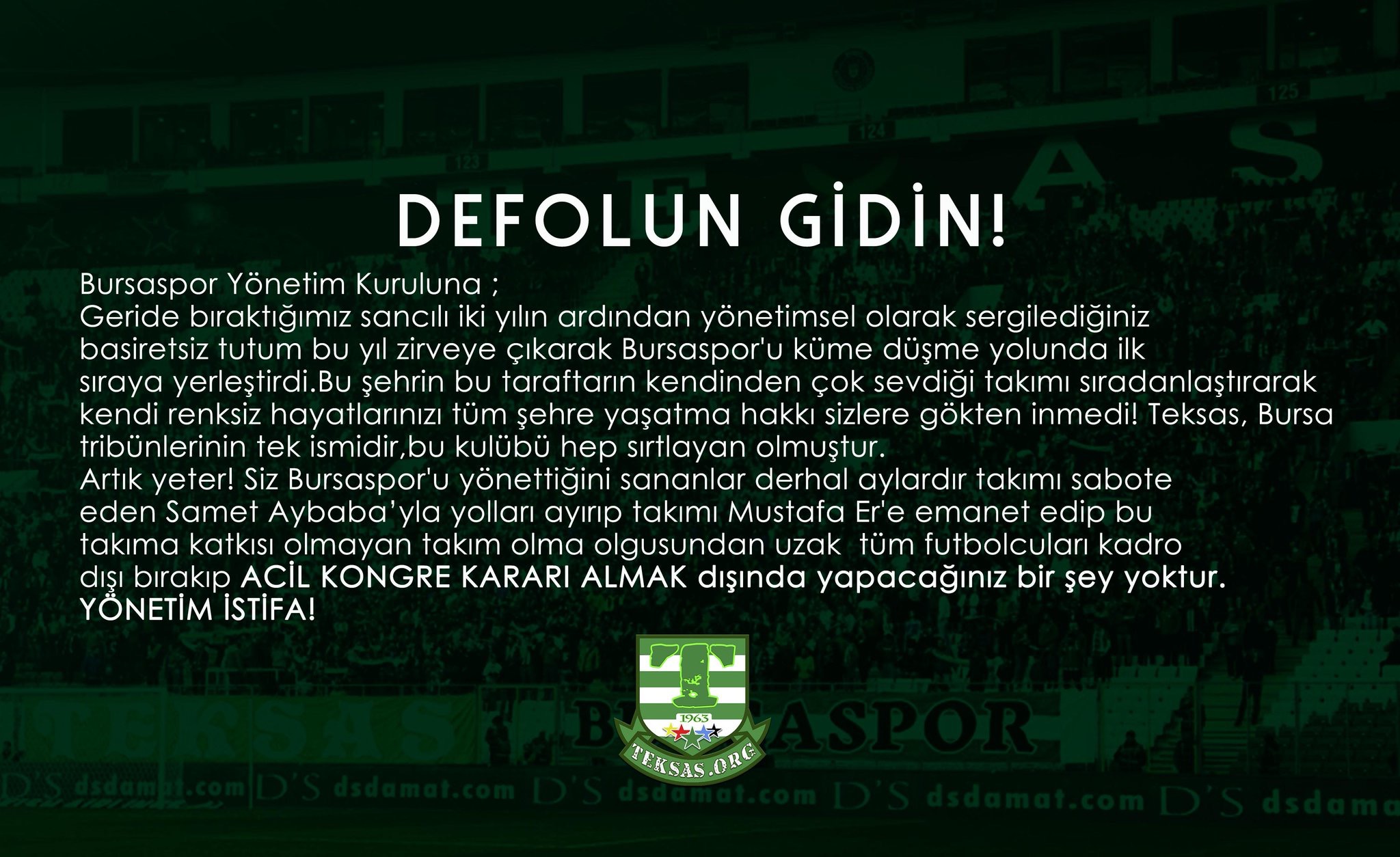 Geride bıraktığımız sancılı iki yılın ardından yönetimsel olarak sergilediğiniz basiretsiz tutum bu yıl zirveye çıkarak Bursaspor‘u küme düşme yolunda ilk sıraya yerleştirdi.Bu şehrin bu taraftarın kendinden çok sevdiği takımı sıradanlaştırarak kendi renksiz hayatlarınızı tüm şehre yaşatma hakkı sizlere gökten inmedi! Teksas Bursa tribünlerinin tek ismidir, bu kulübü hep sırtlayan olmuştur.