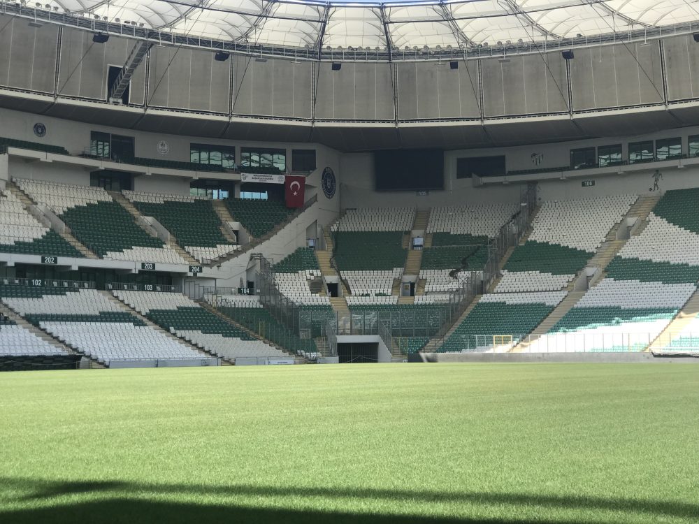 Deplasman tribünü köşeye çekilirken aşağıya doğru da uzatıldı. Bu şekilde hem deplasman takımlarının taraftarlarının oraganize hareket etmesi kısıtlanırken hem de Bursaspor taraftarına daha çok koltuk alanı verilmiş olunacak.