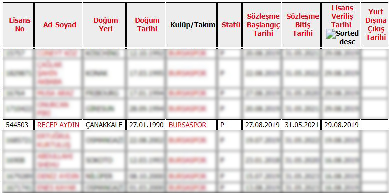 Bursaspor Kulübü, Türkiye futbol Federasyonu‘na orta saha oyuncusu Recep Aydın‘ın sözleşmesini iletti ve lisansını çıkarttı. 29 yaşındaki oyuncu geçtiğimiz sezon Ümraniyespor‘da kiralık olarak forma giyerken 26 maçta 5 gol ve 4 asistlik performans sergiledi.
