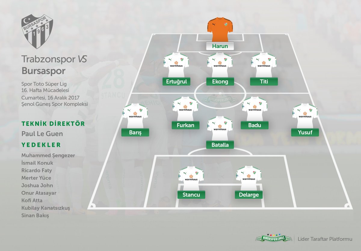 Süper Lig'in 16. haftasında deplasmanda Trabzonspor ile karşılaşacak Bursaspor'un ilk 11'i belli oldu.