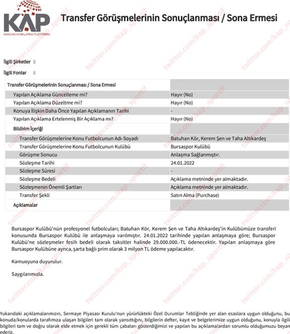 Trabzonspor Kulübü Kamuoyu Aydınlatma Platformuna (KAP) yaptığı bildirimde Bursaspor'dan Batuhan Kör, Kerem Şen ve Taha Altıkardeş ile anlaşıldığını açıkladı.