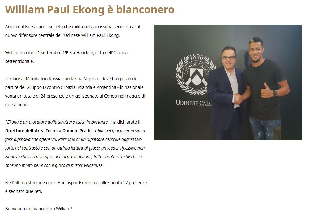 Udinese‘nin resmi internet sitesinden Nijeryalı oyuncunun kariyer bilgilerine yer verildi ve “Siyah-beyazlı takıma hoş geldin” ifadeleri yer aldı.