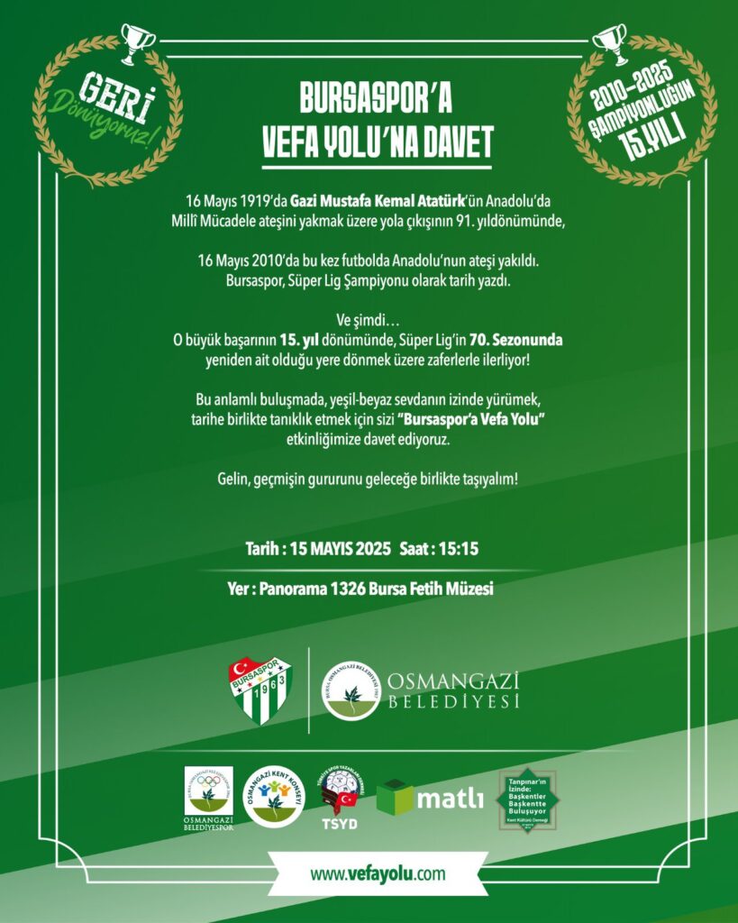 Osmangazi Belediyesi tarafından sosyal medya hesaplarından yapılan paylaşımda “Bursaspor’un Süper Lig şampiyonluğunun 15. yılında, yeşil-beyaz sevdamızla “Vefa Yolu” etkinliğinde buluşuyoruz.” ifadeleri kullanıldı.