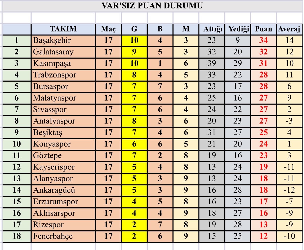 VAR olmasaydı ilk yarı sonunda puan durumu nasıl olurdu?