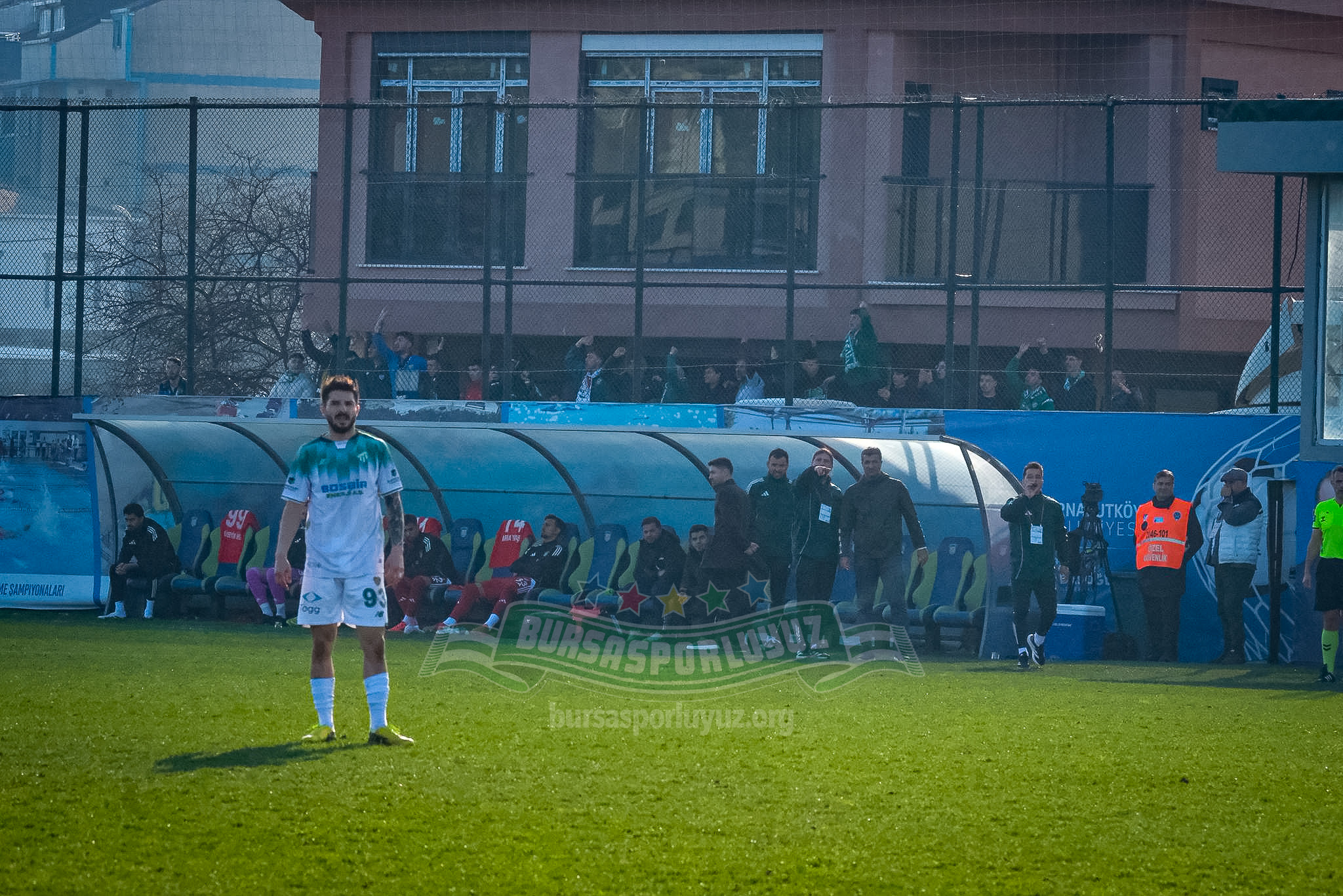 Yer kalmadığı ya da bilet bulunamadığı için mi bilmiyorum ama, Bursasporlu bazı taraftarlar Arnavutköy yedek kulübesinin arkasından takımlarına destek veriyor.